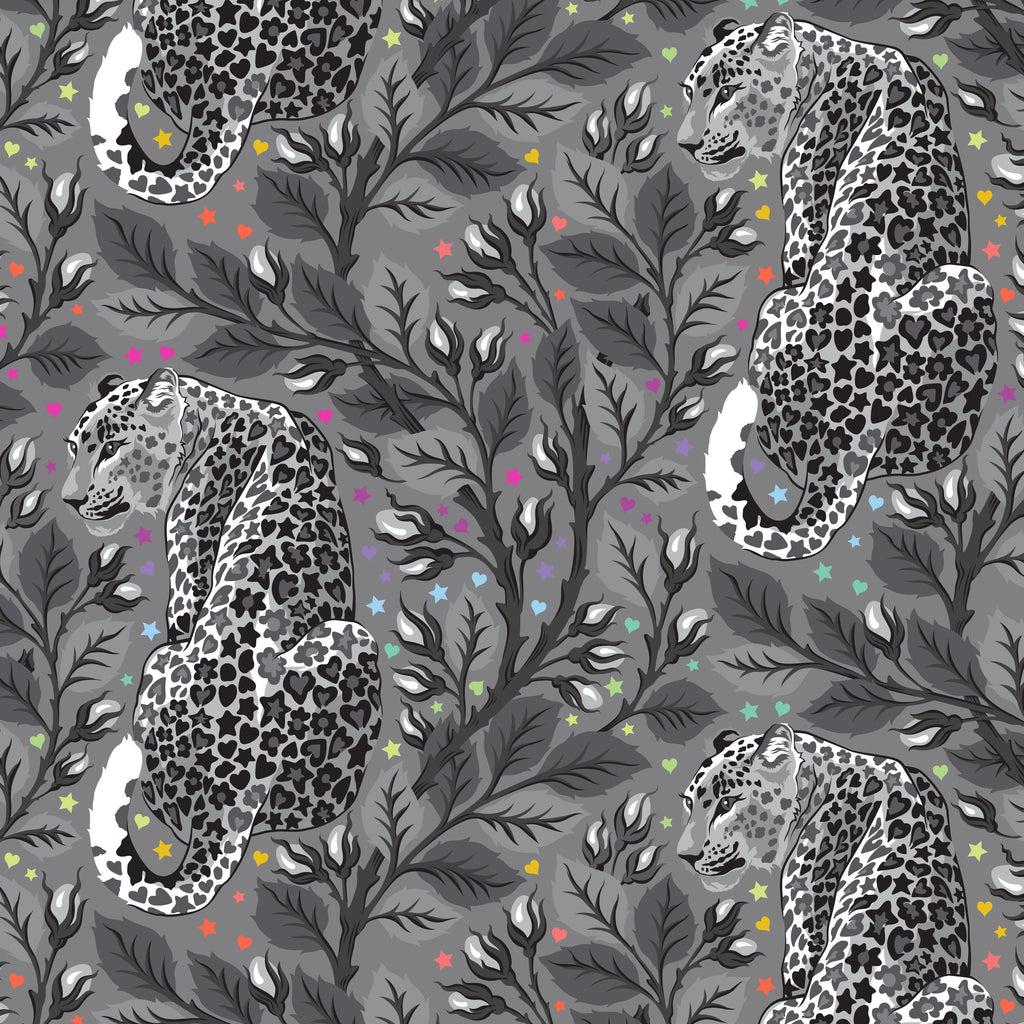 This bold Graywork print by Tula Pink features large, beautifully illustrated leopards resting among lush charcoal foliage, with tiny rainbow stars scattered throughout for a touch of color and whimsy. The grayscale palette creates a dramatic, high-contrast look, while the oversized motifs add striking movement to the design. Perfect for fussy-cutting, standout quilt blocks, bags, pillows, and apparel projects that call for a graphic, modern aesthetic.