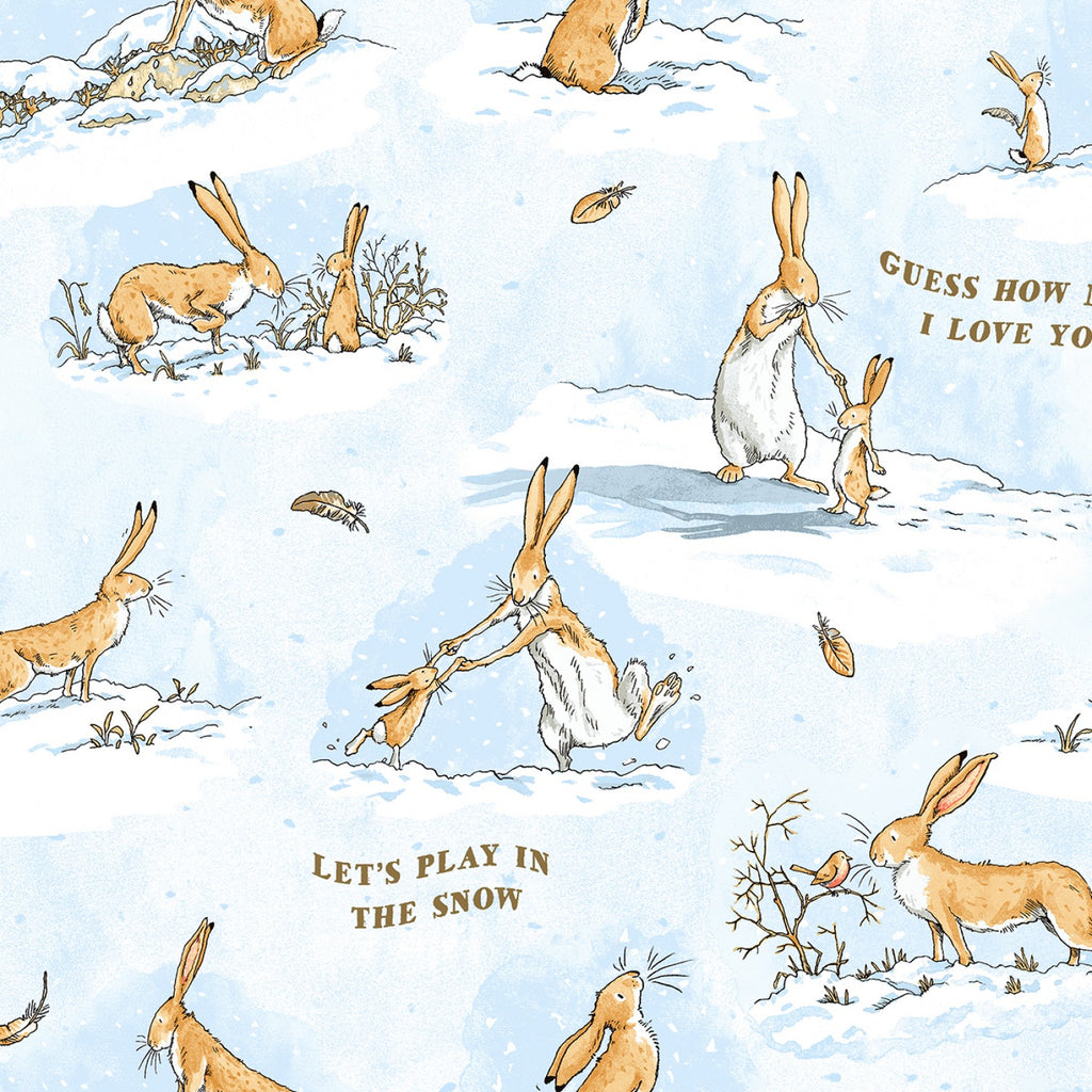 This sweet flannel showcases the Nutbrown Hares in a peaceful outdoor setting, surrounded by grassy meadows and gentle tree silhouettes. The soft light denim background brings a cool, calming tone to the heartwarming illustrations, making it a lovely choice for any child’s space.