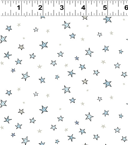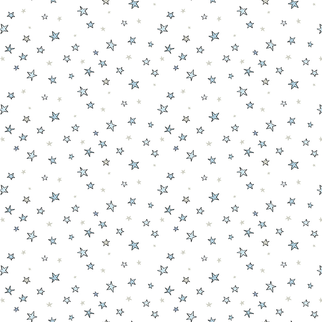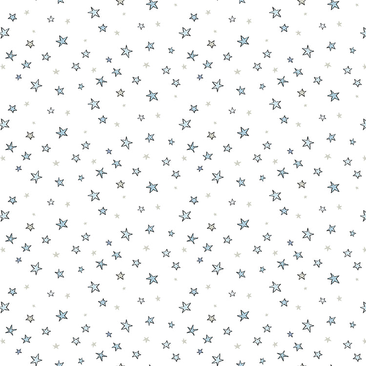 This flannel print features a whimsical scatter of hand-drawn stars in shades of denim blue and soft gray on a white background. The playful yet airy design adds a dreamy touch, making it a perfect coordinate for Guess How Much I Love You projects or any sweet nursery theme.