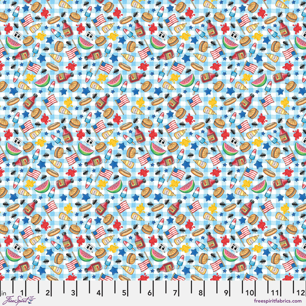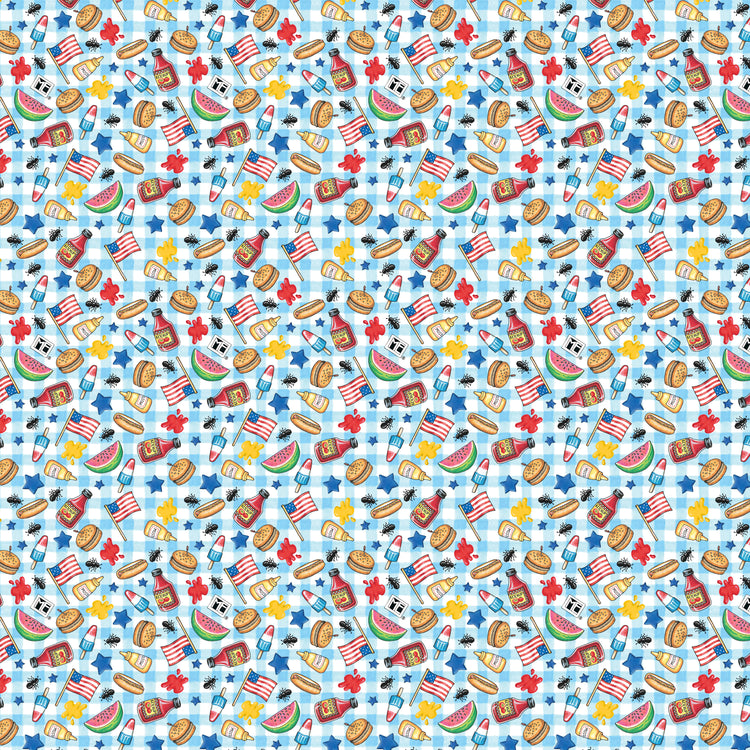This cheerful picnic-style print is filled with classic summer cookout icons—watermelon slices, ice cream pops, burgers, mustard and ketchup bottles, flags, stars, and more—all scattered across a soft blue gingham background. The playful illustrations give it that signature Mary Engelbreit charm, perfect for summer quilts, table décor, kitchen accessories, picnic projects, and July 4th sewing. Printed on 100% cotton.