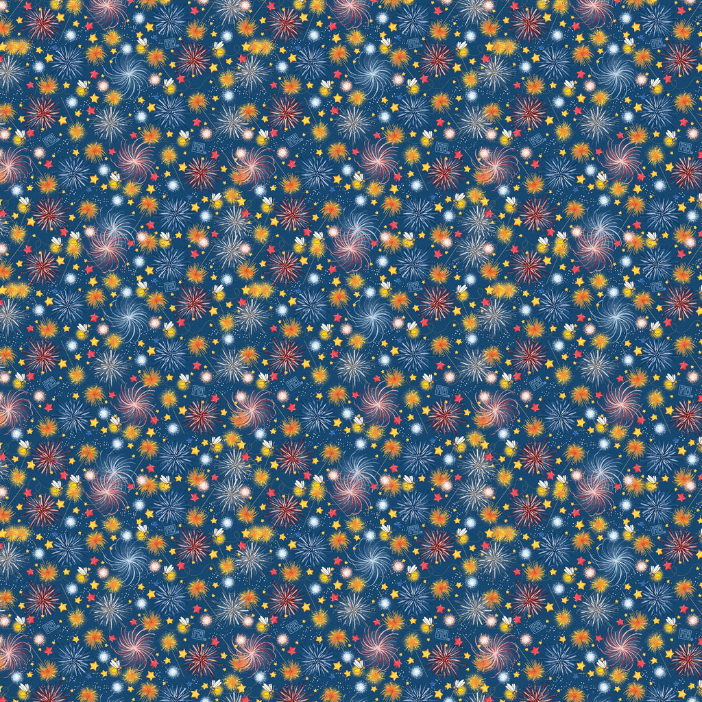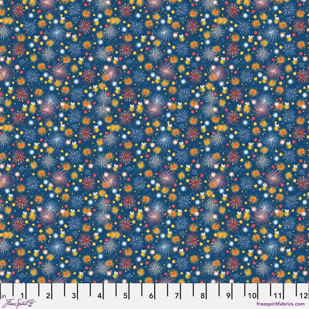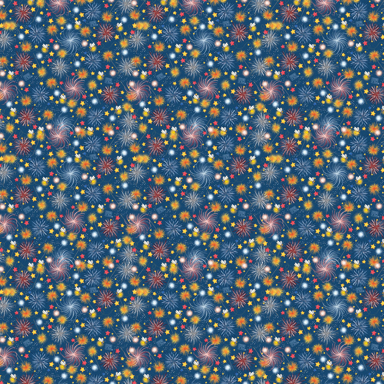 This vibrant navy print bursts with colorful fireworks, sparkling stars, and swirling light trails—capturing the excitement of summer celebrations and July 4th festivities. The lively, allover design makes a perfect accent for patriotic quilts, picnic décor, table toppers, and festive holiday projects. Printed on 100% cotton.