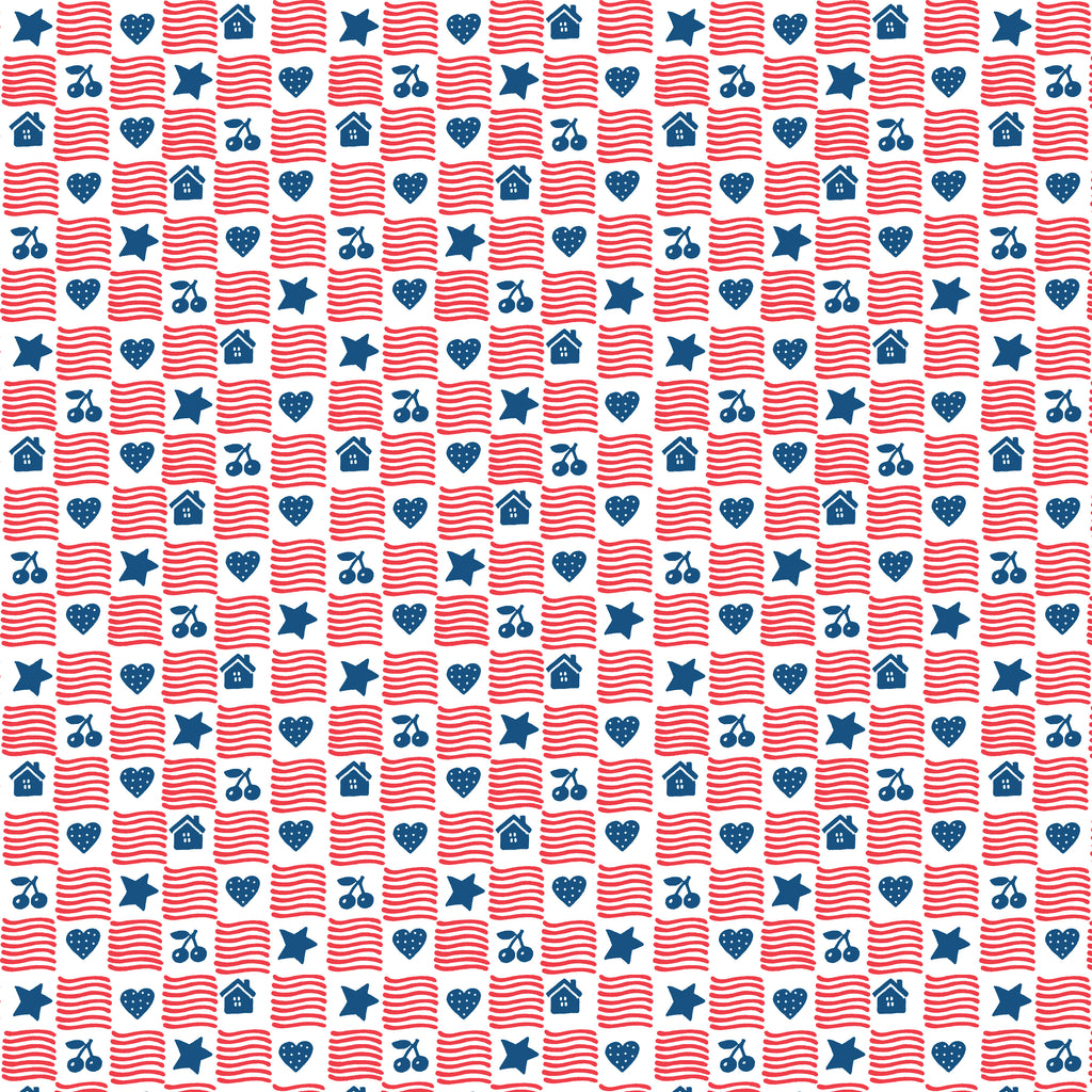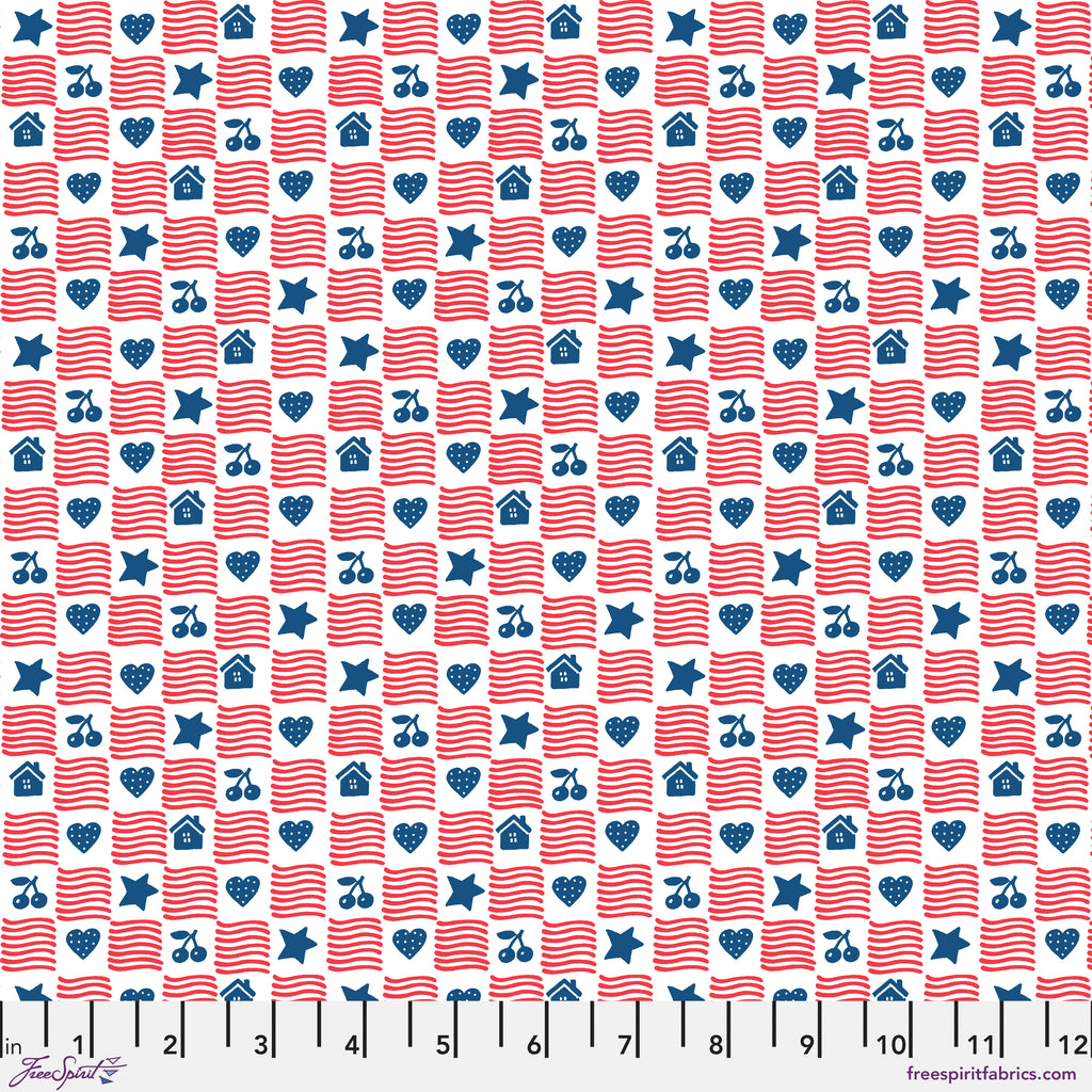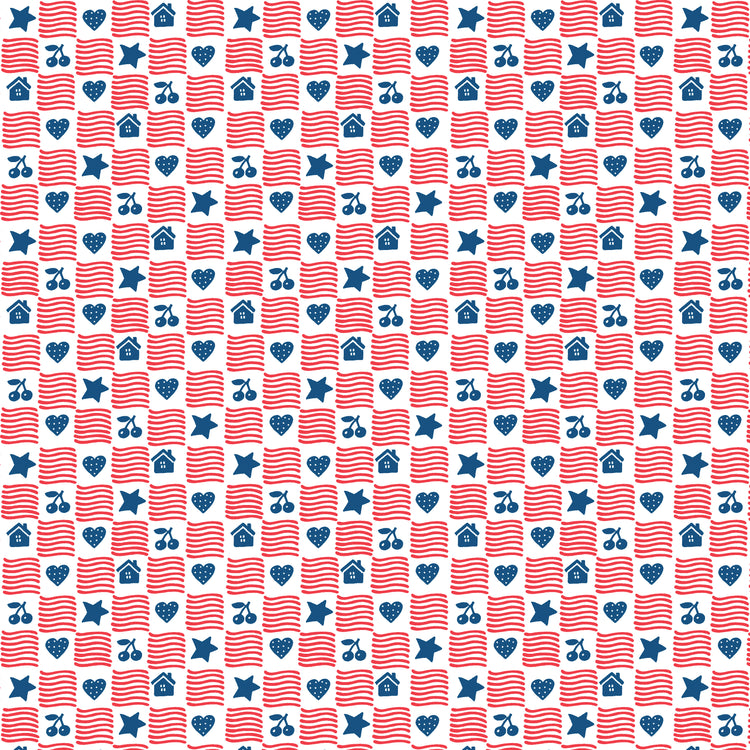 This adorable small-scale check features alternating red wavy stripes and blue Americana icons—stars, hearts, cherries, and tiny houses—arranged in a tidy grid. The simple, hand-drawn look gives it classic Mary Engelbreit charm and makes it perfect for patriotic quilts, summer projects, table décor, and festive accents. Printed on 100% cotton.