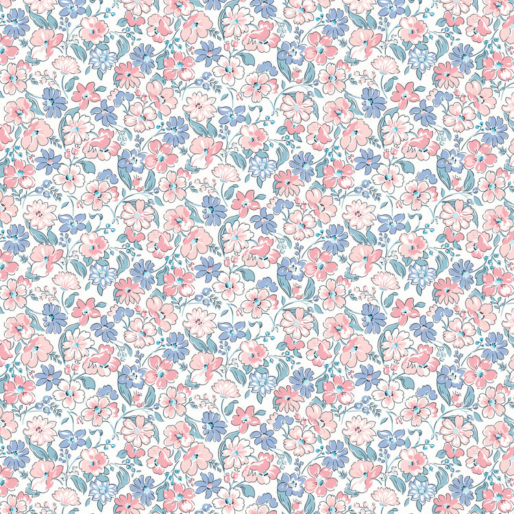 Floral Joy D from Liberty Fabrics' Heirloom Collection is a gentle small-scale floral print featuring an array of blossoms in shades of pink and blue, complemented by teal foliage on a soft white background. The design's dense, multidirectional layout creates a lively, textural effect, making it suitable for both focal pieces and coordinating prints in quilting projects. Traditionally screen printed onto Liberty’s 100% Lasenby cotton—a fabric specifically developed for quilting and craft projects—this fabric offers a soft yet durable finish, ideal for quilting, home décor, and heirloom sewing projects.
