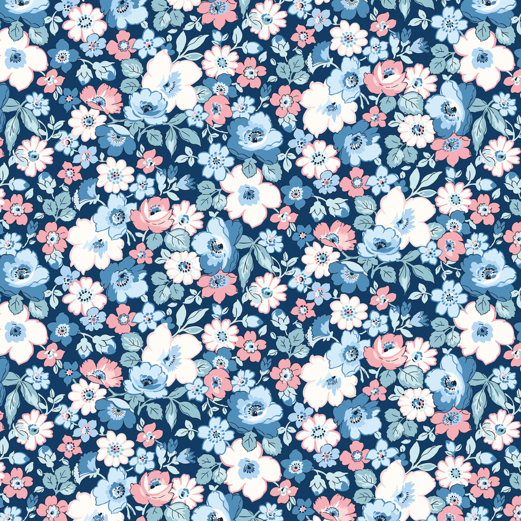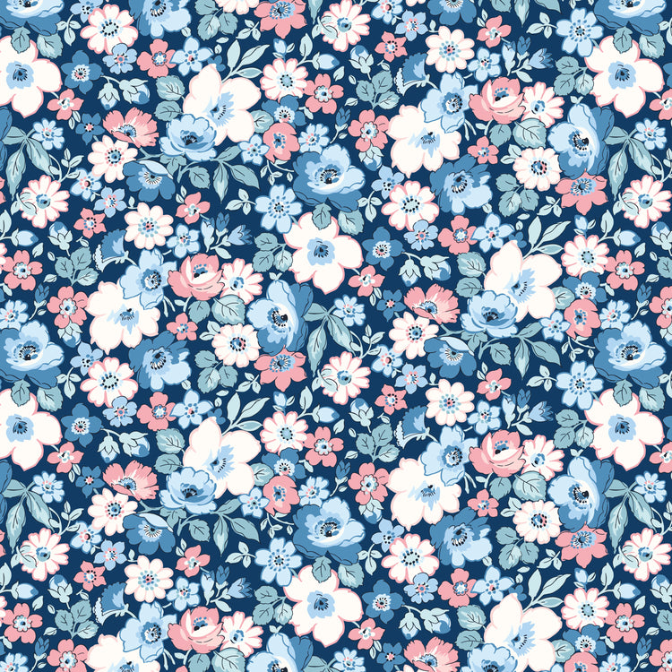 Hedgerow Bloom D from Liberty Fabrics' Heirloom Collection is a richly detailed floral print featuring densely packed roses, daisies, pinks, and anemones in shades of pink, blue, and white on a deep navy background. Traditionally screen printed onto Liberty’s 100% Lasenby cotton—a fabric specifically developed for quilting and craft projects—this fabric offers a soft yet durable finish, ideal for quilting, home décor, and heirloom sewing projects.