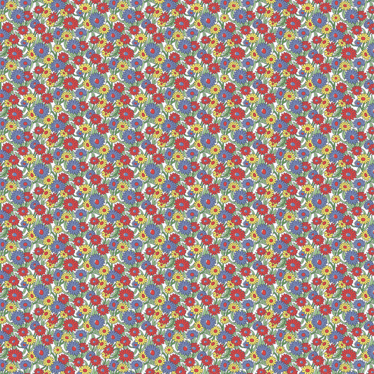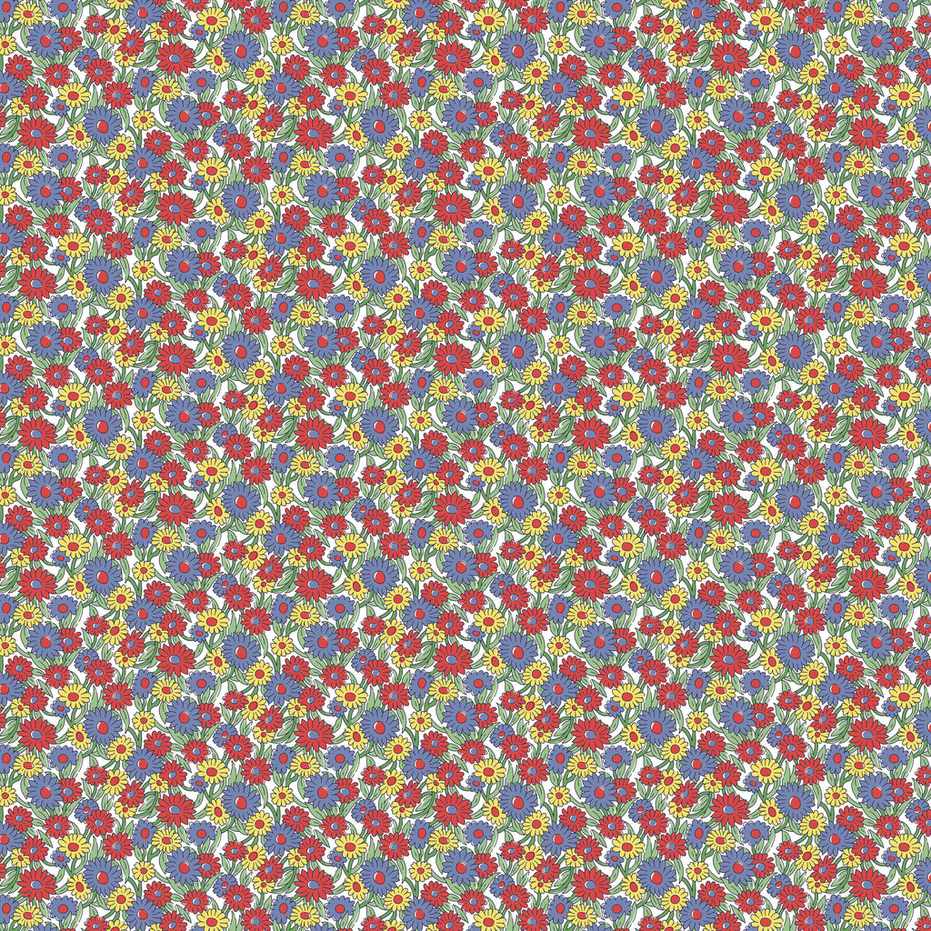Marguerite Meadow B from Liberty Fabrics' Heirloom Collection is a vibrant celebration of the British countryside. This design features a joyful scattering of stylized marguerite daisies in rich red, soft blue, and sunny yellow hues, dancing across a soft cream background. Traditionally screen printed onto Liberty’s 100% Lasenby cotton at their Italian print mill, the fabric offers a soft yet durable finish, ideal for quilting, home décor, and heirloom sewing projects. The small-scale floral pattern brings a timeless, vintage-inspired charm to any creation.