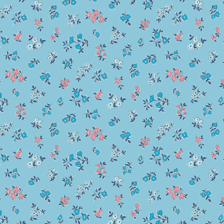 Posy Sprig D from Liberty Fabrics' Heirloom Collection is a delicate floral print inspired by hand-painted artwork. It features charming sprigs and posies in shades of blue and coral, scattered across a soft blue background. The design offers ample ground space, making it an ideal crafting coordinate reminiscent of freshly picked blooms. Traditionally screen printed onto Liberty’s 100% Lasenby cotton—a fabric specifically developed for quilting and craft projects—this fabric provides a soft yet durable finish, perfect for quilting, home décor, and heirloom sewing projects.