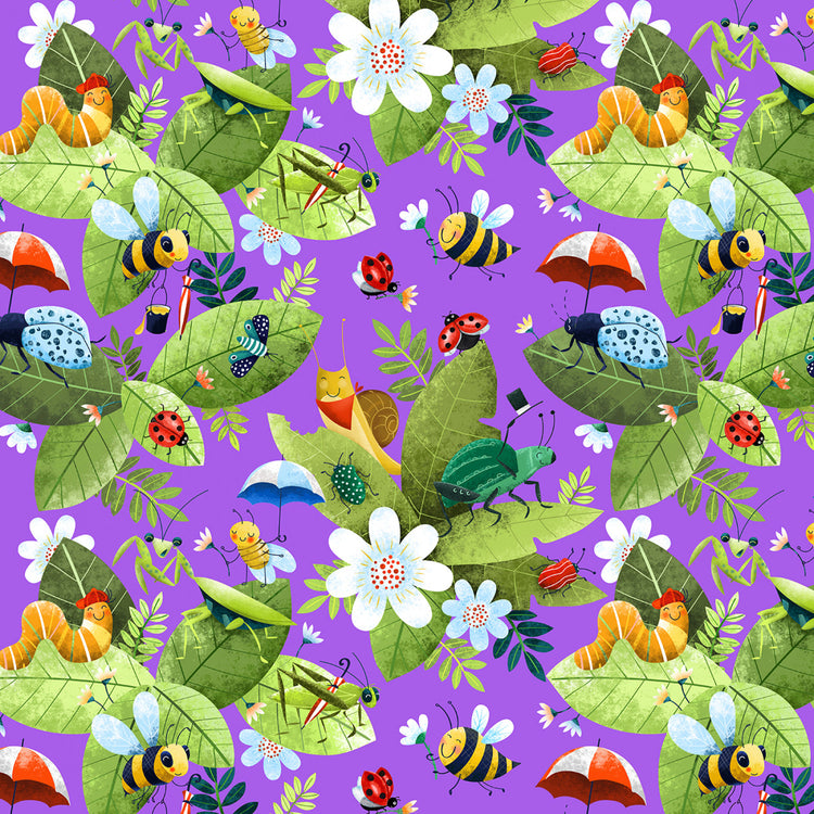 This vibrant fabric features a whimsical design set against a rich purple background, showcasing an enchanting world of nature. Large green leaves form the backdrop for a delightful array of creatures including bees, ladybugs, snails, and caterpillars, all engaged in playful activities. White flowers and small blue umbrellas add to the charm, creating a lively scene that's perfect for projects that need a touch of fantasy and fun.