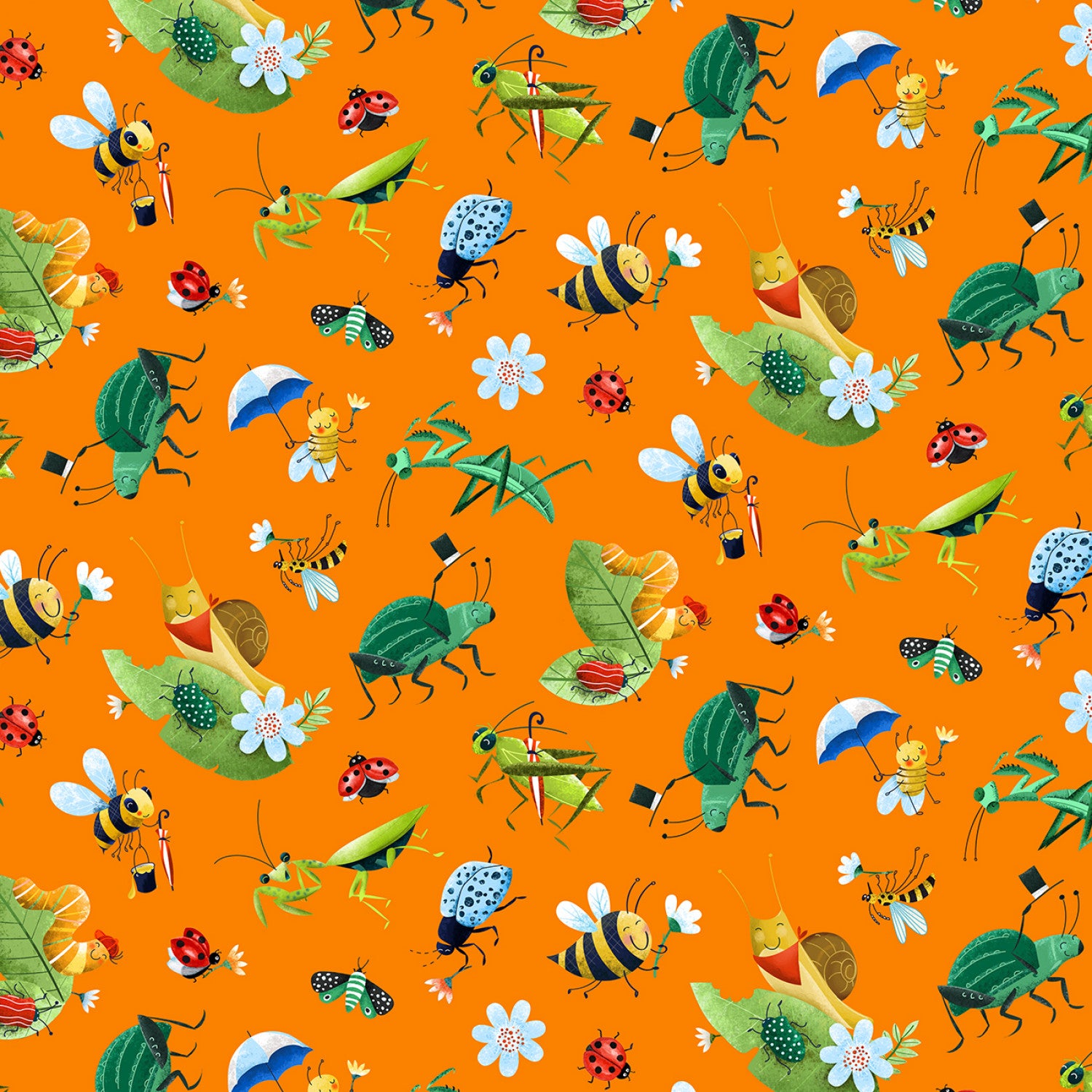 This vibrant fabric features a playful design of various insects including bees, ladybugs, and grasshoppers, all engaging in whimsical activities like holding umbrellas or wearing hats, set against a bright orange background. The insects are depicted on large green leaves and white flowers, creating a lively and cheerful scene perfect for adding a touch of fun to any project.