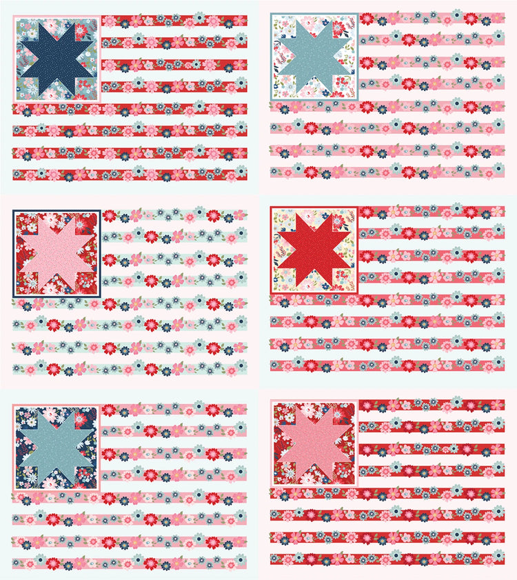 This fabric features a vibrant and festive design with six distinct flag designs, each showcasing a unique star pattern set against a background of red, white, and blue stripes adorned with delicate floral motifs. The stars vary in color, including navy, teal, pink, and red, adding a playful touch to the patriotic theme. Perfect for crafters looking to create quilts, banners, or other celebratory projects, this 100% cotton fabric provides a durable and high-quality base for various sewing projects.