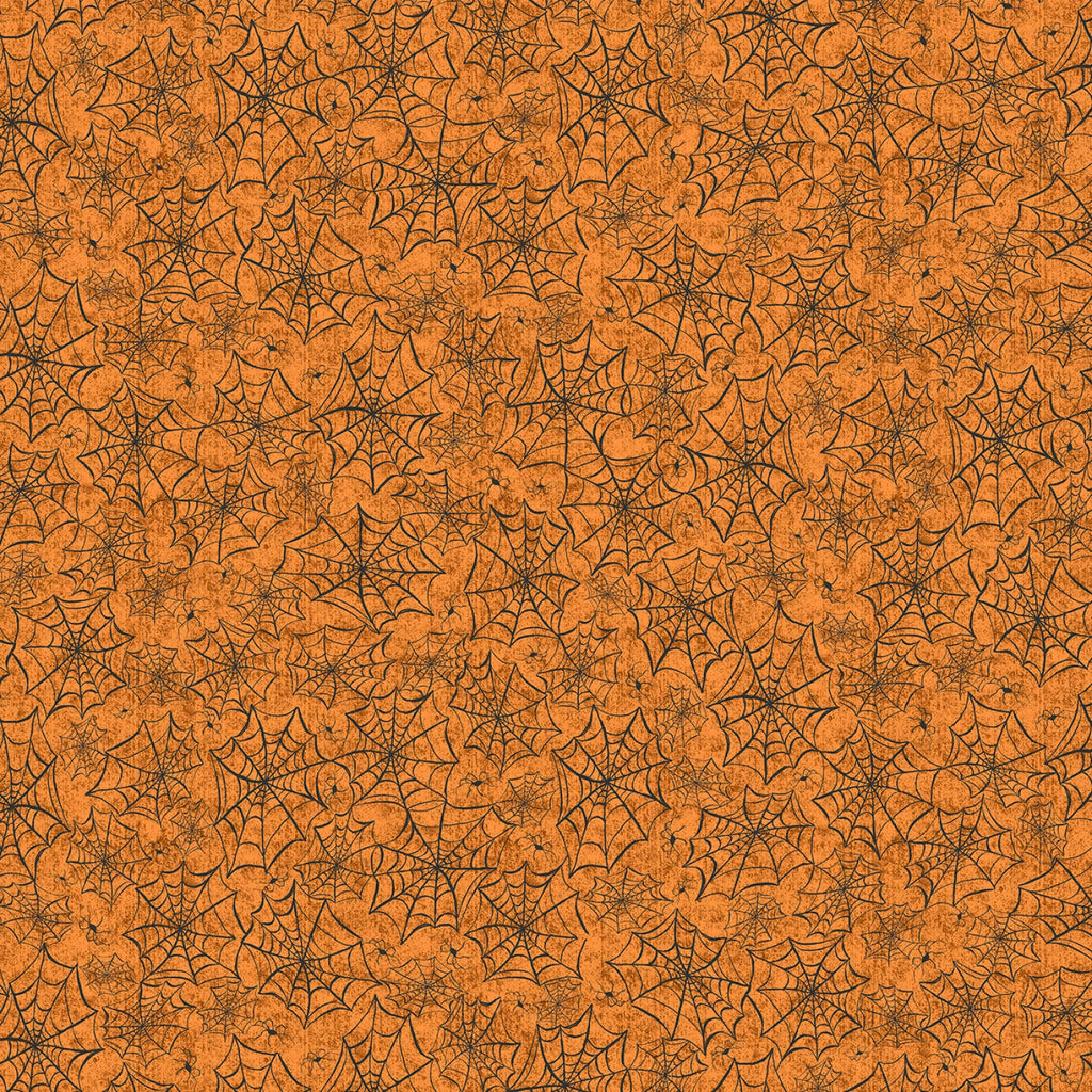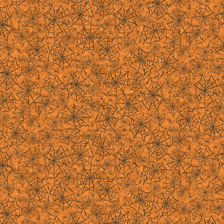 This vibrant fabric features an allover design of black spider webs intricately woven across an orange background, creating a striking and festive look perfect for Halloween-themed projects or any project needing a touch of spooky charm. The pattern is dense, ensuring that the spider webs are visible throughout, adding a unique texture and visual interest to your creations.