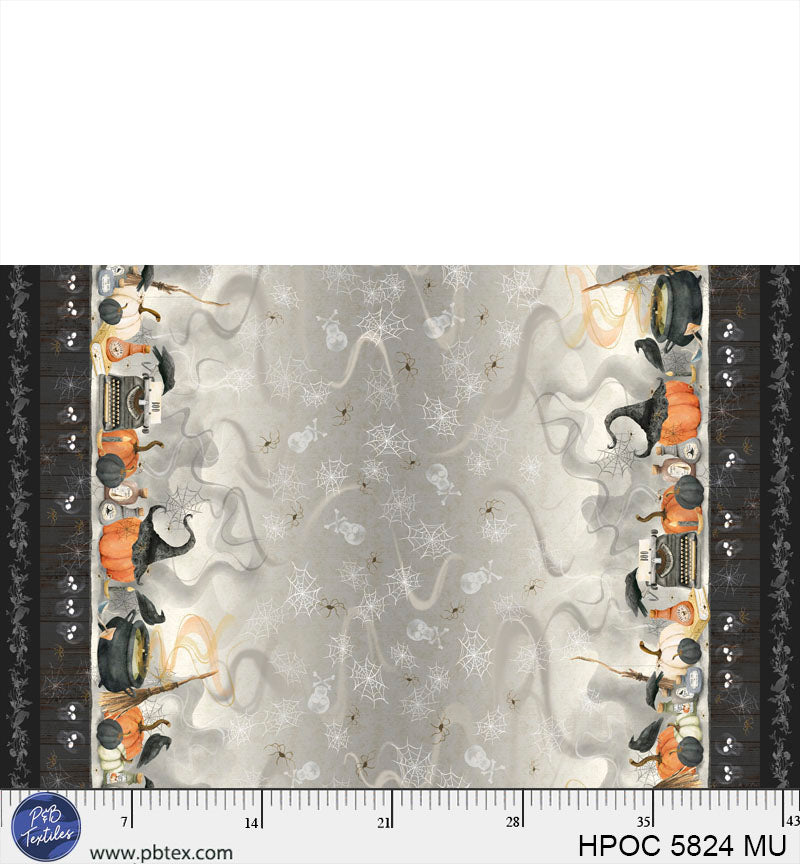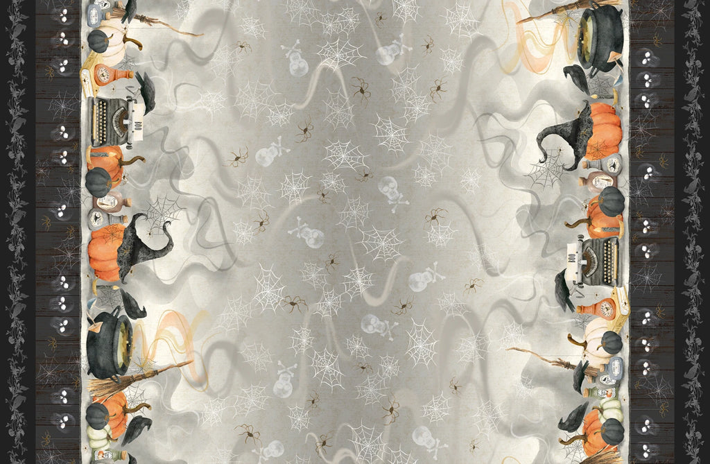 This enchanting fabric features a double border design with a spooky theme, perfect for adding a touch of Halloween magic to any project. The central design showcases a misty, web-filled background with swirling patterns, creating an eerie yet whimsical atmosphere. The borders are adorned with classic Halloween imagery including pumpkins, witch hats, cauldrons, and crows, set against a dark backdrop, enhancing the festive feel.