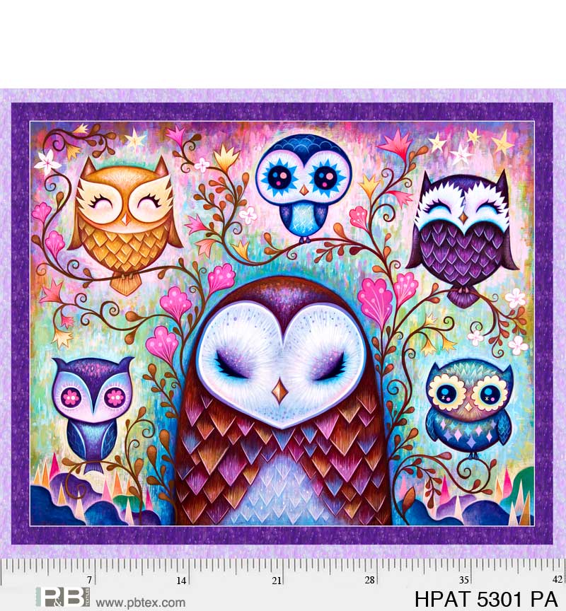 This 36"x42" panel features a family of owls. 100% Cotton, Sold by the Panel.