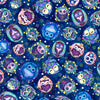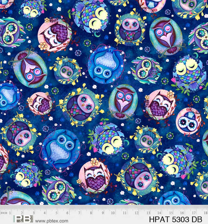 This print features tossed owls on a dark blue background.