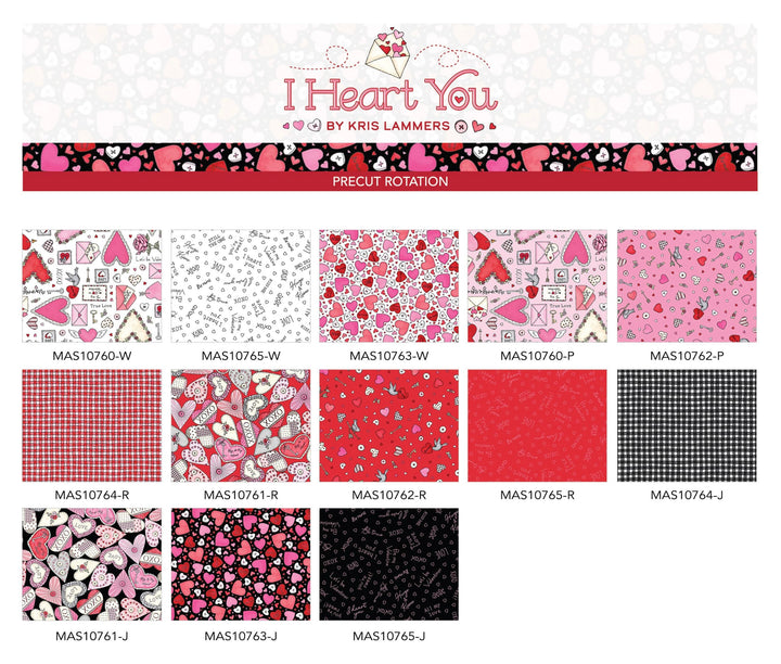 "I Heart You" is a charming love letter to Valentine's Day. It features delightful illustrations in classic Kris Lammers style and uses a lovely palette of reds, pinks, and black. Whether you're looking to make sentimental quilts, gifts for your friends, or whimsical holiday table settings, this darling collection holds the key to our hearts and our favorite projects.