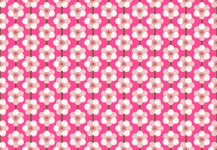 Delicate white and peachy-pink daffodils contrast against a bright fuchsia pink background. A playful, high-energy print with charming vintage appeal. 100% cotton.