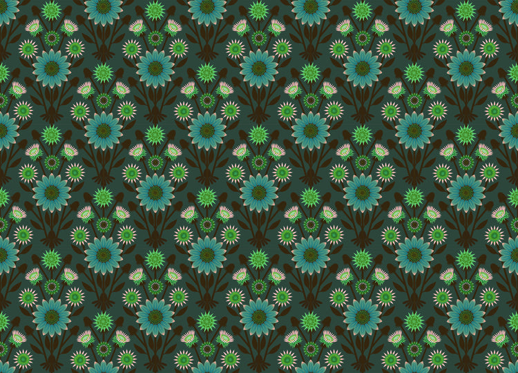 This 100% fabric depicts the full lifespan of the echinacea flower, from fresh bloom to seed head, in stylized mirrored arrangements. Soft teal and patina greens provide a serene backdrop for the warm pink and coral petals, creating a balanced, medallion-like repeat. This print blends natural rhythm with artistic structure, making it perfect for standout blocks, botanical themes, or fussy cut applications.