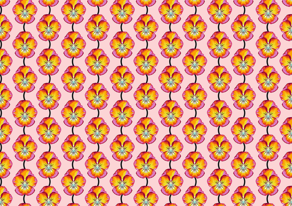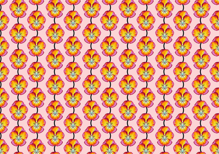 Bright orange and magenta pansies bloom across a soft pink background in this lively floral print. The stylized flowers create a vibrant rhythm that's perfect for fussy cutting or adding bold blocks to any project.