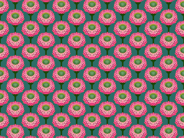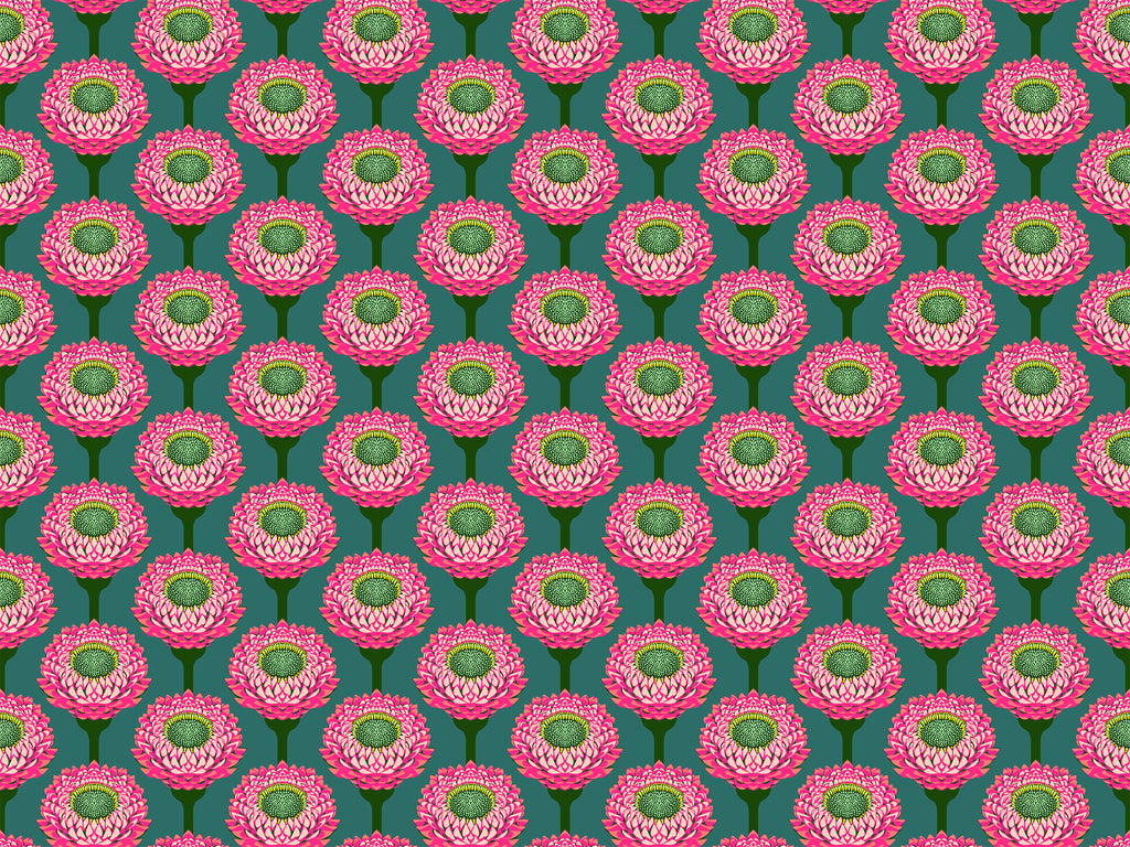 This 100% cotton fabric features candy pink strawflowers bloom in perfect rows against a dusty teal background. Their petal texture and symmetry make this an eye-catching choice for fussy cuts and bold blocks.