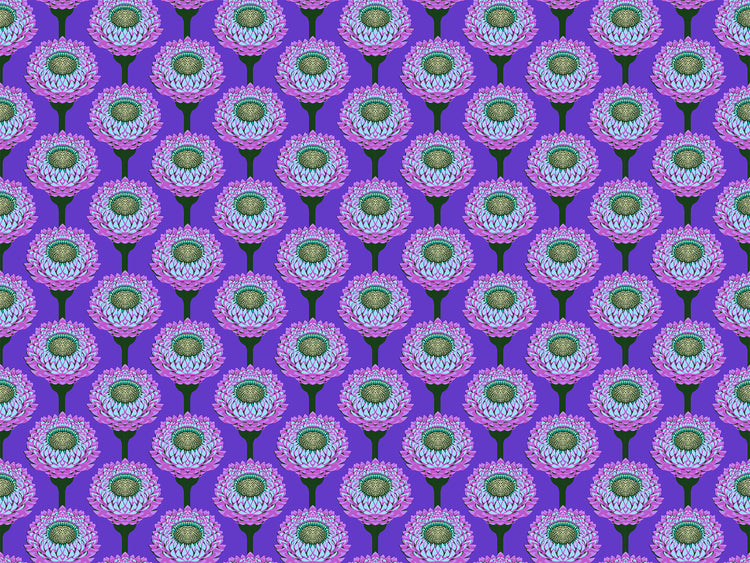 This 100% cotton fabric features lavender strawflowers with delicate petal detailing, arranged in tidy rows against a rich periwinkle-violet background. The vibrant contrast and structured layout give this print a bold, dreamy presence—perfect for striking focal blocks, fussy cutting, or adding a vintage-inspired pop to modern quilts.