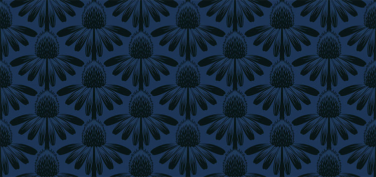 Embrace the allure of the evening with Coneflower in Night. This captivating two-tone print features stylized coneflower blooms set against a deep, moody background, offering a sophisticated contrast. The intricate linework adds depth and movement, making it a versatile choice for quilts, garments, or home décor that seek a touch of nocturnal elegance.