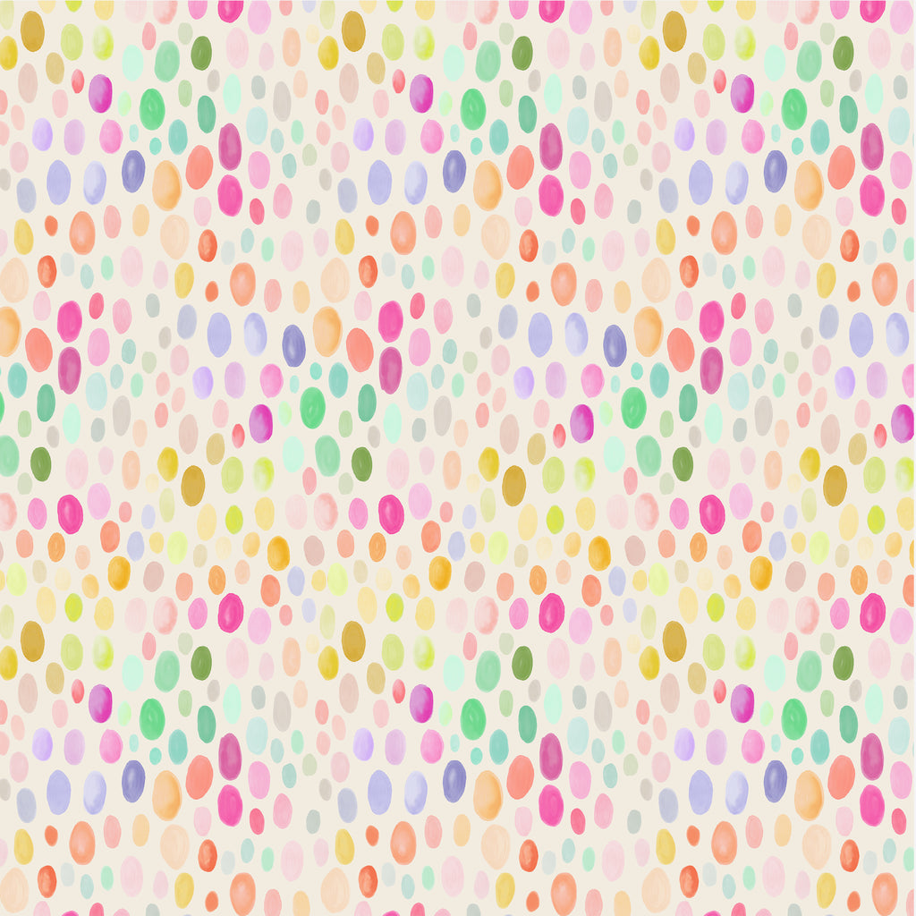 This cheerful print features scattered watercolor-style dots in a rainbow of bright pastel shades on a soft white background. The loose, playful layout makes it a perfect blender that adds energy and movement without overpowering other prints. 100% cotton.
