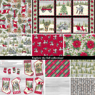 "It’s Christmas Time" pays homage to the holiday season on the farm. The barn is all decorated in lights for this festive season. Sleds and sleighs are loaded with presents to place under the Christmas tree. Through the falling snow, you can just barely see the birch tree forest. Accent your holiday decor with the plaid and snow filled patterns in this group. Get started by using the stocking pattern to spark your creative spirit. 100% Cotton.