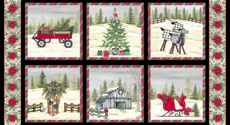 "It’s Christmas Time" pays homage to the holiday season on the farm. The barn is all decorated in lights for this festive season. Sleds and sleighs are loaded with presents to place under the Christmas tree. Through the falling snow, you can just barely see the birch tree forest. Accent your holiday decor with the plaid and snow filled patterns in this group. Get started by using the stocking pattern to spark your creative spirit. 100% Cotton.