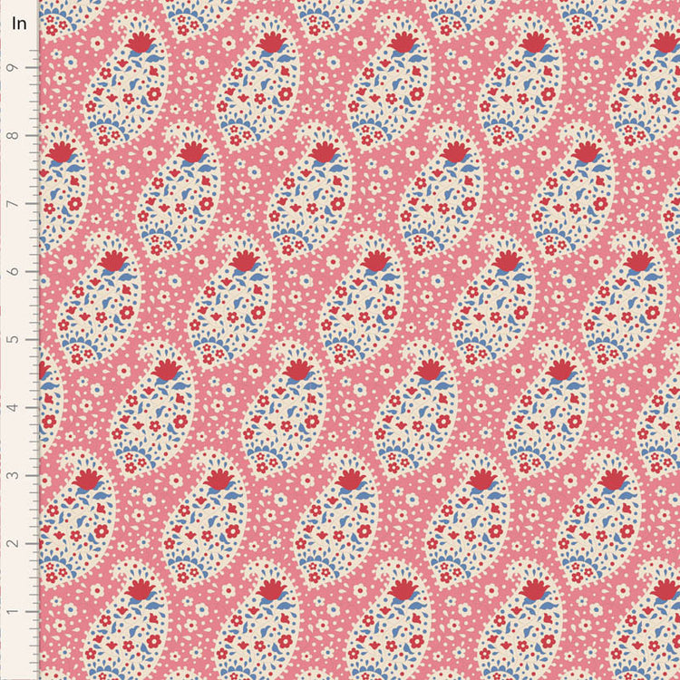Playful and fresh, “Teardrop Pink” from Tilda’s Jubilee collection features cream paisley shapes filled with tiny red, blue, and pink flowers, each topped with a small red bloom. Scattered floral sprigs fill the rosy pink background, creating a sweet, vintage look perfect for quilts and cheerful sewing projects.