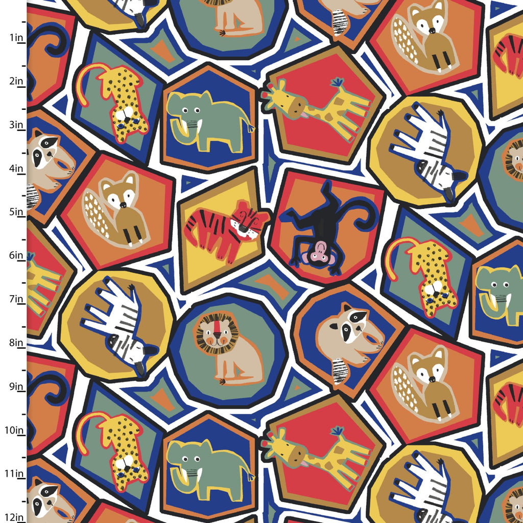 This 100% cotton print by Michael Moon features playful jungle animals framed in colorful geometric shapes. Lions, zebras, giraffes, elephants, monkeys, and more pop against bold red, blue, gold, and green backdrops, outlined with sketchy hand-drawn lines for a fun, modern feel. Perfect for children’s quilts, playroom décor, or fussy-cut projects, this lively design brings energy and character to any sewing creation.