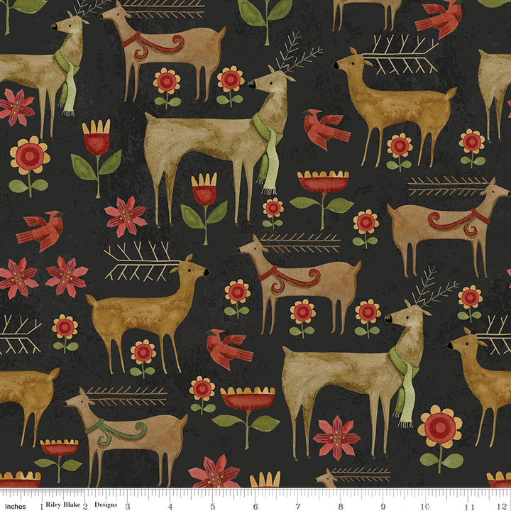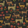 This print features reindeer, cardinals, and flowers on a dark gray background.