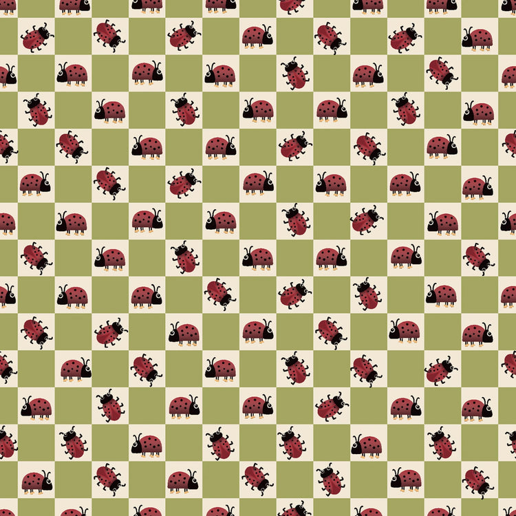 This 100% cotton print features a playful checkerboard design with alternating squares of red ladybugs and olive green, creating a charming and versatile pattern (6-inch repeat). The small-scale motif adds a whimsical touch, making it perfect for quilting, children’s projects, or as a fun accent in larger designs.