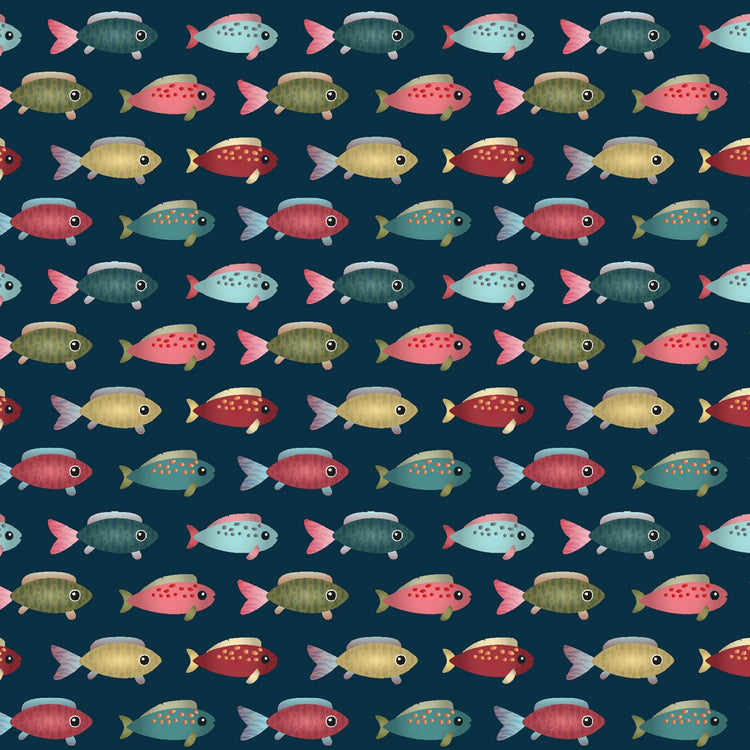 This 100% cotton print features rows of colorful fish in shades of teal, red, gold, and green swimming across a deep navy background (2-inch repeat). The small-scale aquatic design adds a playful touch and pairs beautifully with the collection’s frog and lily pad prints, making it ideal for quilts, children’s projects, or fun summer décor.
