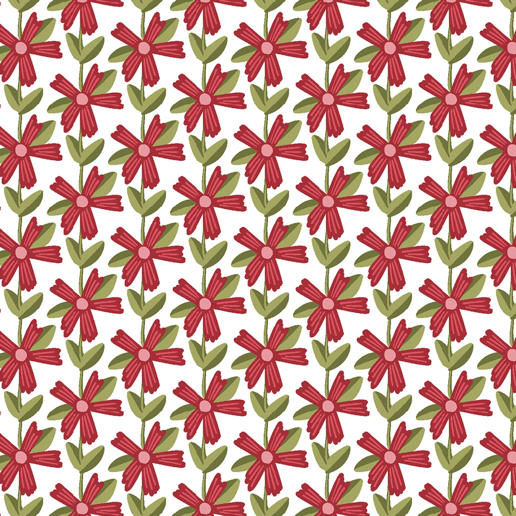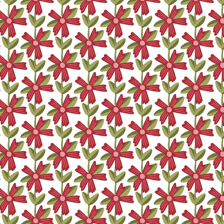 This 100% cotton print features rows of stylized red flowers with green leaves arranged in a neat, repeating pattern against a crisp white background (4-inch repeat). The simple yet bold floral design adds a cheerful pop of color, making it ideal for quilting, summer projects, or as a fresh accent in home décor.