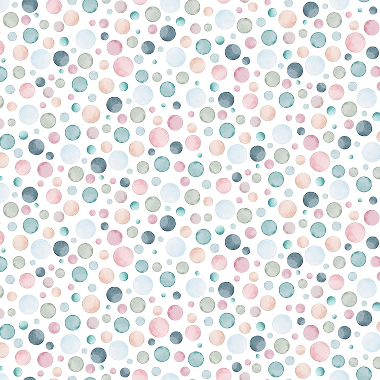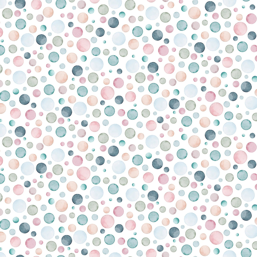Playful watercolor dots in soft pastels of blush, mint, sky blue, and slate scatter across a clean white background in this cheerful coordinate. The hand-painted look ties beautifully with the dreamy watercolor artwork of the Let’s Go on an Adventure collection, adding a touch of lightness and movement. It works perfectly as a modern blender or binding, giving your projects a fresh, airy finish without overpowering the main prints.