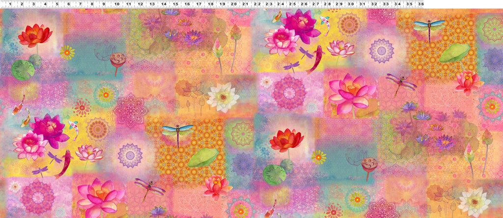 This digitally printed vibrant print from the Lily Pond collection features a glowing patchwork of lotus blooms, koi fish, dragonflies, and ornate mandalas. The rainbow-washed background blends pinks, golds, aquas, and purples in soft watercolor layers, giving the fabric an ethereal, luminous feel. Each block offers its own mix of florals, linework, and texture, making it a stunning statement print for quilt fronts, borders, and home décor. A showstopper for anyone who loves bright color and detailed artwork.