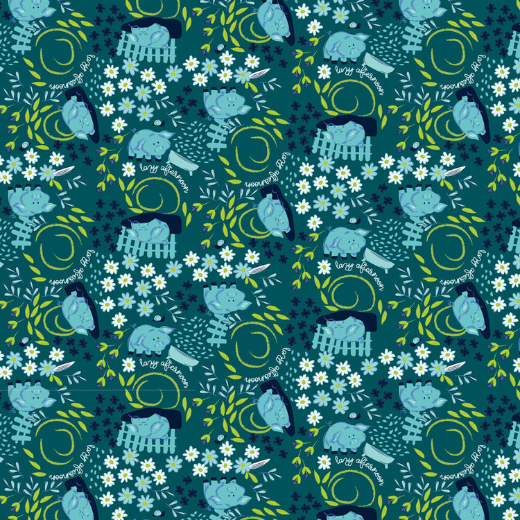 This cozy tossed print features napping pigs, flowers, leafy accents, and the phrase “lazy afternoon” scattered across a deep teal background. The sweet farm imagery and soft, whimsical style make it ideal for children’s quilts, novelty projects, bags, and playful farmhouse sewing. Digitally printed for crisp detail and rich color on high-quality 100% cotton.