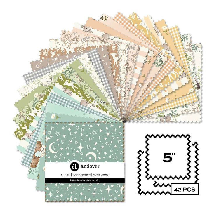This 5” Charm Pack by Makower UK includes 42 precut 5” x 5” squares in 100% cotton quilting fabric. Featuring sweet woodland animals, soft florals, classic ginghams, and gentle star prints in soothing sage, teal, peach, yellow, and warm neutrals, this bundle makes coordinating effortless. Perfect for baby quilts, nursery projects, patchwork, and small handmade gifts, these ready-to-sew squares save time while showcasing the full charm of the collection.