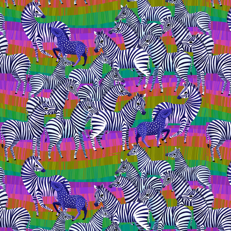 Bold and full of movement, this striking print features a lively herd of zebras set against a vivid rainbow-striped backdrop. The mix of deep indigo, magenta, and lime green creates an energetic, almost kaleidoscopic effect that captures the wild beauty of the savanna in Katy Tanis’s signature style. Printed on 100% premium cotton from FreeSpirit Fabrics, it’s perfect for quilt backs, statement blocks, and colorful creative projects that call for a burst of personality.