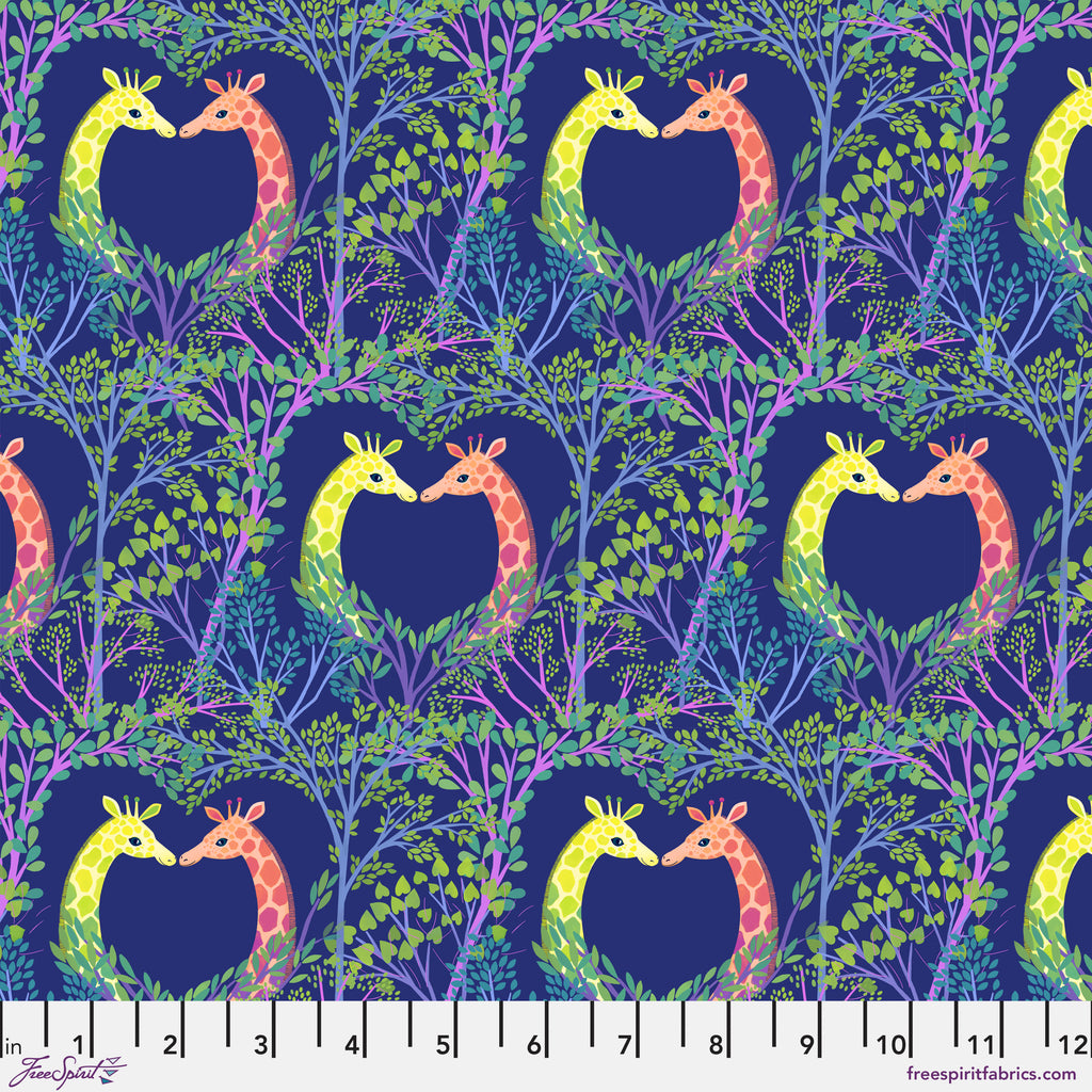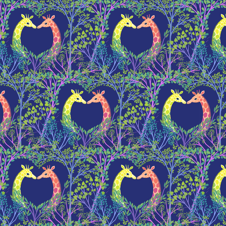 Two giraffes form a heart shape with their long necks in this sweet, nature-inspired print by Katy Tanis. Surrounded by colorful foliage and set against a rich navy background, the design radiates warmth, affection, and a touch of whimsy. Printed on 100% premium cotton from FreeSpirit Fabrics, it’s perfect for quilts, children’s projects, and nature-themed décor.