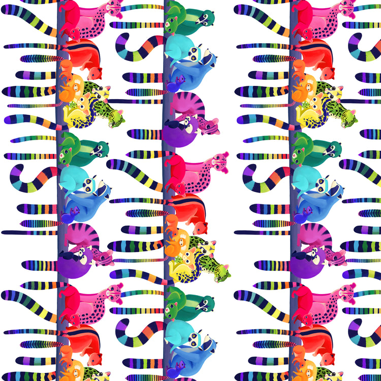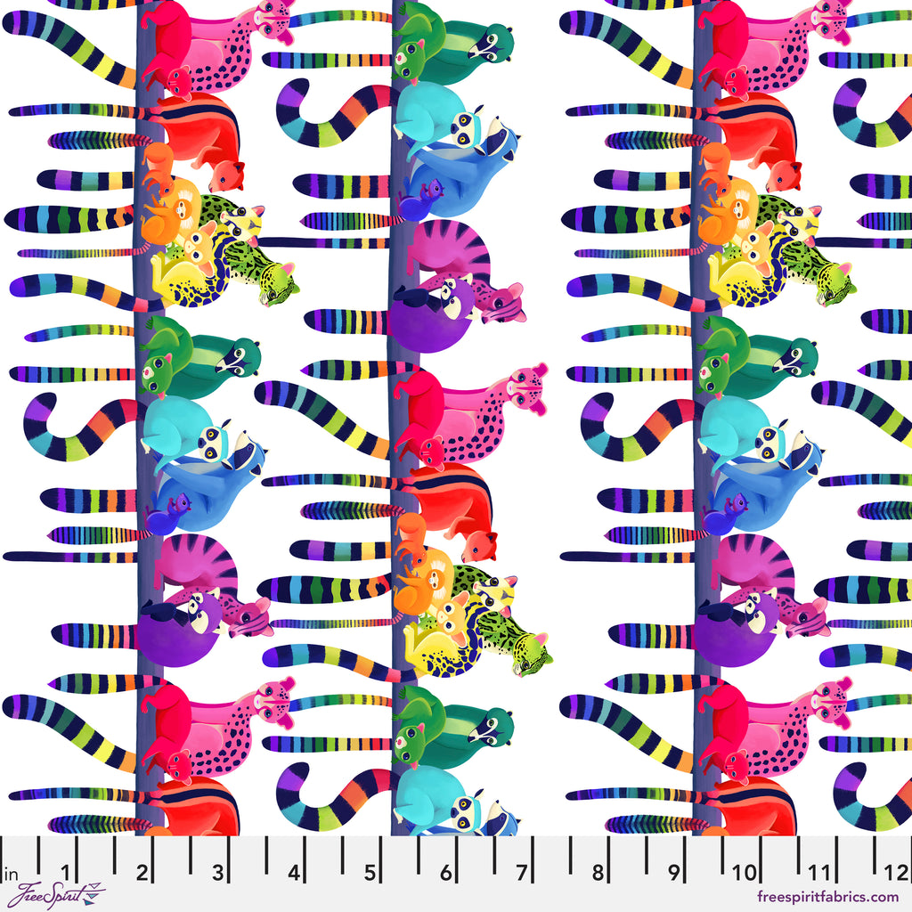 Rainbow-hued ringtails and colorful wild cats climb and cuddle in this vibrant border print by Katy Tanis. The mirrored layout runs along both selvage edges, creating a playful design that’s perfect for quilt borders, skirts, and statement sewing projects. Printed on 100% premium cotton from FreeSpirit Fabrics, its lively color palette and joyful animal artwork bring energy and warmth to any creation.