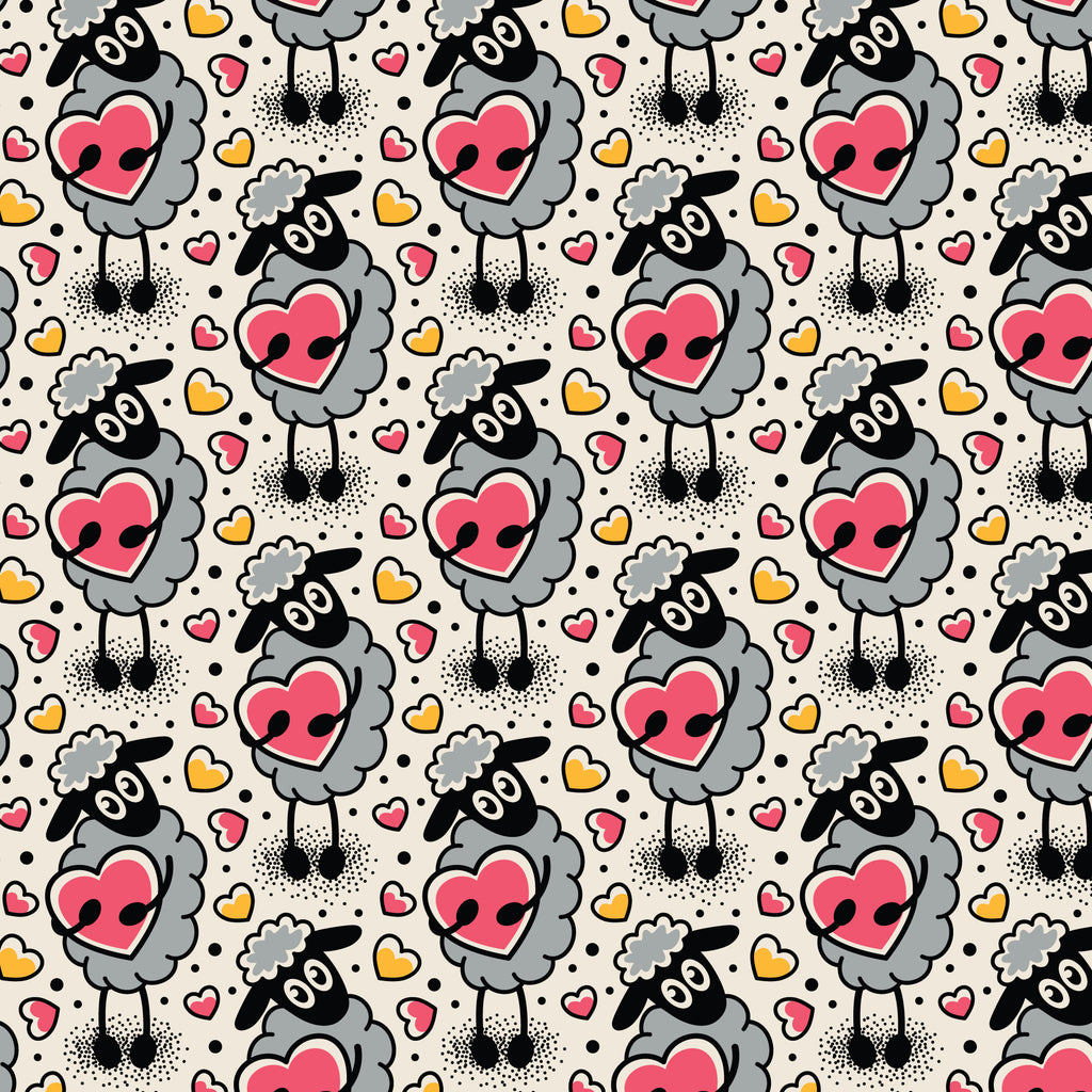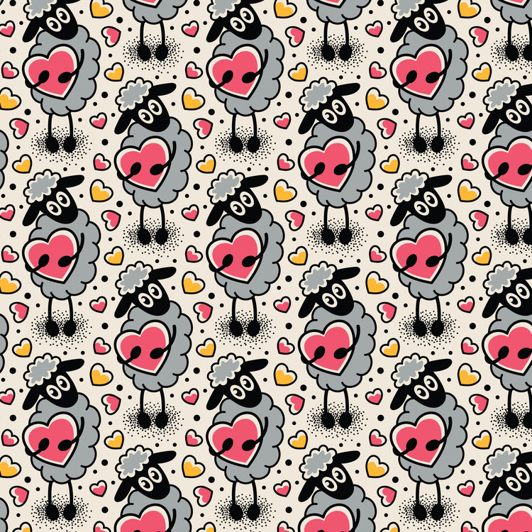 This playful print features adorable hand-drawn sheep holding big pink hearts, surrounded by scattered mini hearts and soft dotted accents. The sketchy style and warm palette give it a sweet, modern feel—perfect for quilts, kids’ projects, baby items, and Valentine-inspired makes. Printed on Cloud9’s premium 100% organic cotton.