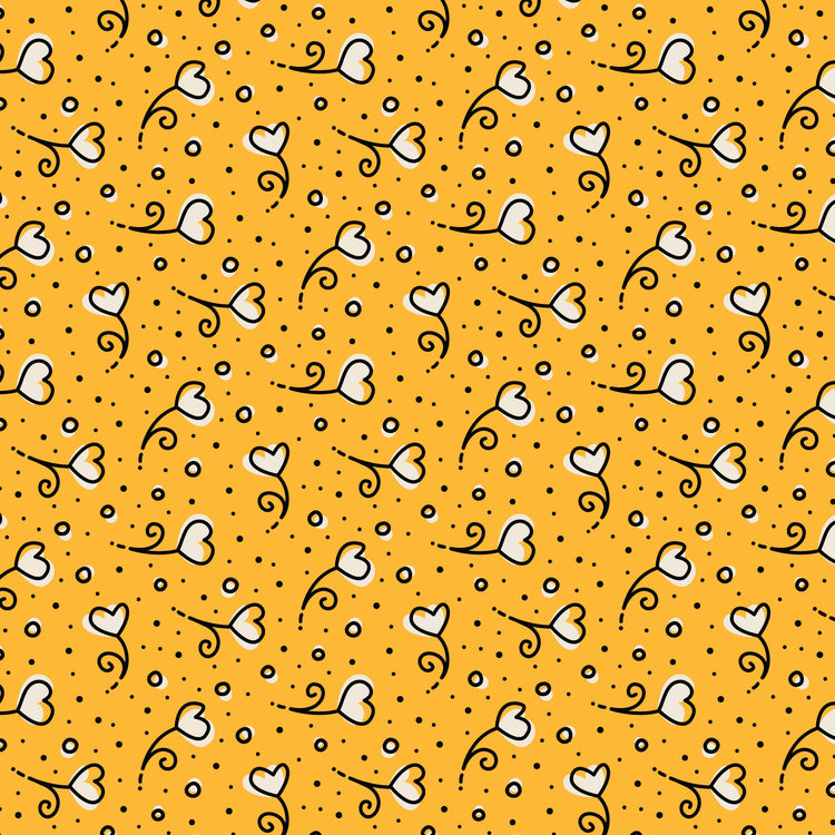 This cheerful print features tiny white heart-shaped blooms scattered across a golden yellow background, accented with flowing black stems and light dotted details. The simple, hand-drawn style gives it a sweet, modern look that works beautifully for quilts, baby items, bags, and bright accent projects. Printed on Cloud9’s premium 100% organic cotton.