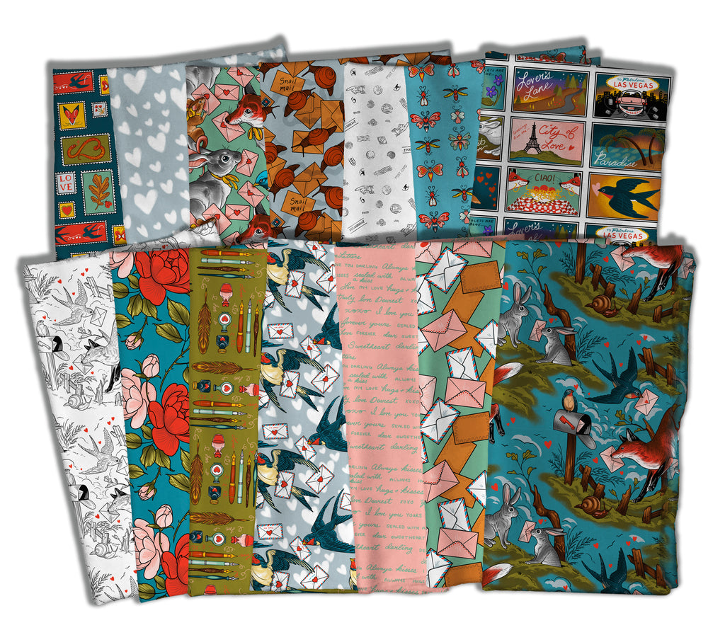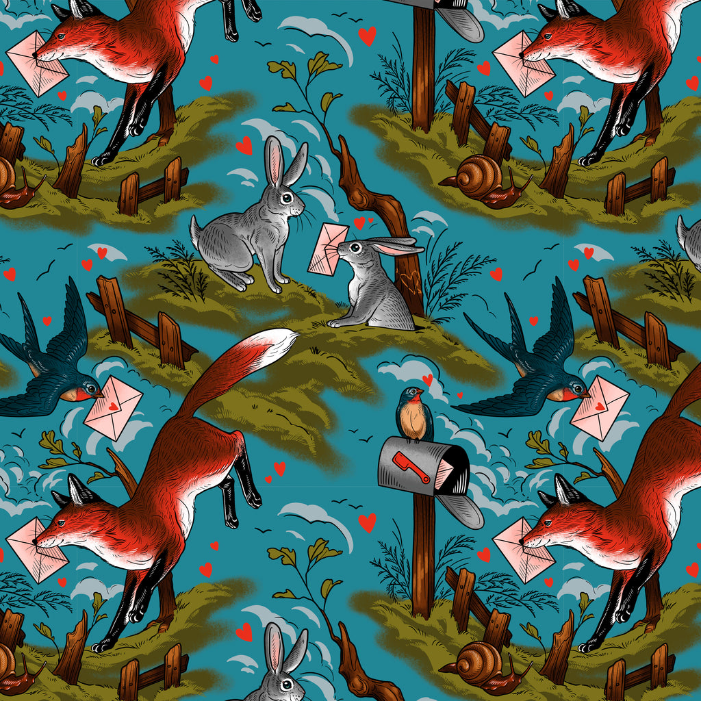 Mail Toile – Multi from Love Letters by Rachel Hauer is a whimsical storybook print featuring foxes, rabbits, birds, and snails delivering love letters across a scenic teal landscape. Scattered envelopes, mailboxes, and tiny hearts add playful detail, while the rich color palette keeps the design feeling bold rather than sweet. A standout novelty print that works beautifully as a feature fabric for quilts, backs, and statement projects.