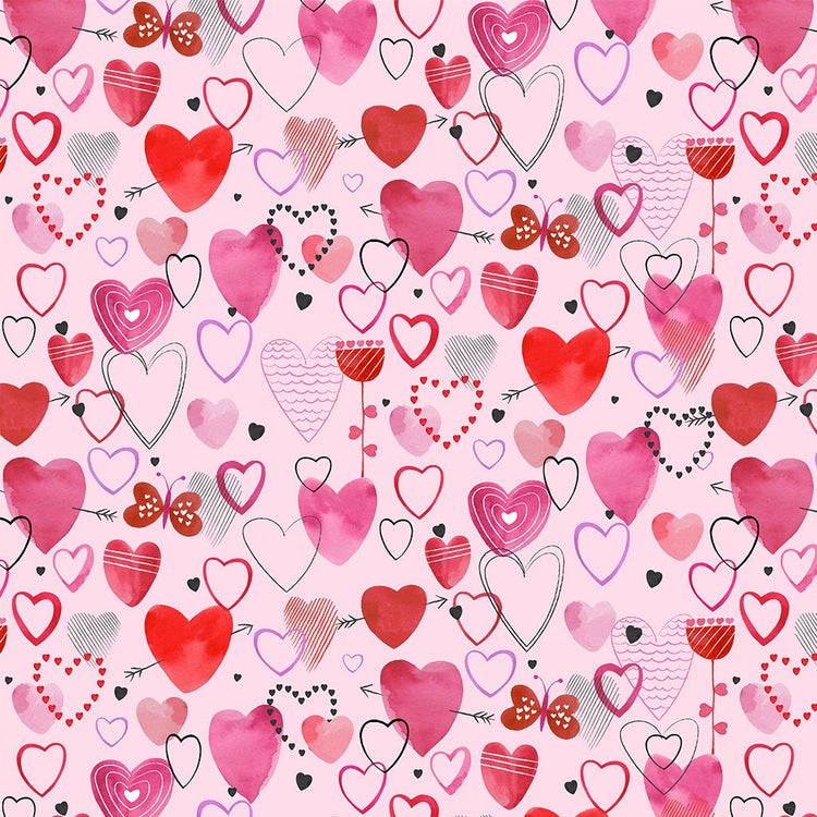 This playful allover heart print features watercolor hearts, doodled outlines, tiny arrows, and sweet accents in shades of red, pink, lavender, and black on a soft pink background. The mix of hand-drawn details and painterly washes gives it a lively, romantic feel that’s perfect for Valentine’s quilts, kids’ projects, bags, and cheerful decor.