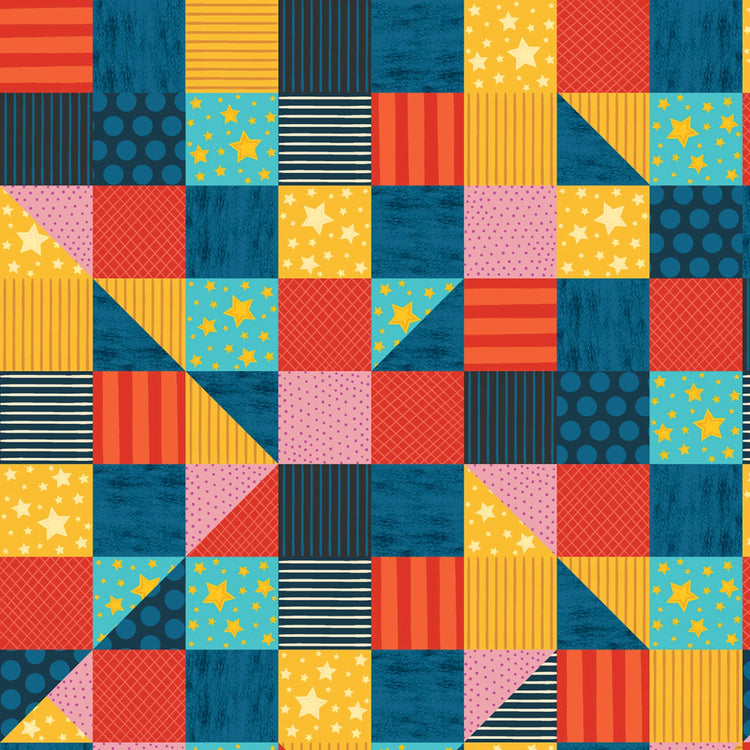 This cheerful fabric features a patchwork design with a delightful mix of geometric shapes and patterns. The design includes squares and triangles in various sizes, adorned with stars, stripes, and polka dots in a colorful palette of red, blue, yellow, and pink. Each block of the patchwork stands out with its unique texture and pattern, creating a dynamic and playful look suitable for a variety of crafting projects.