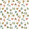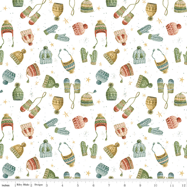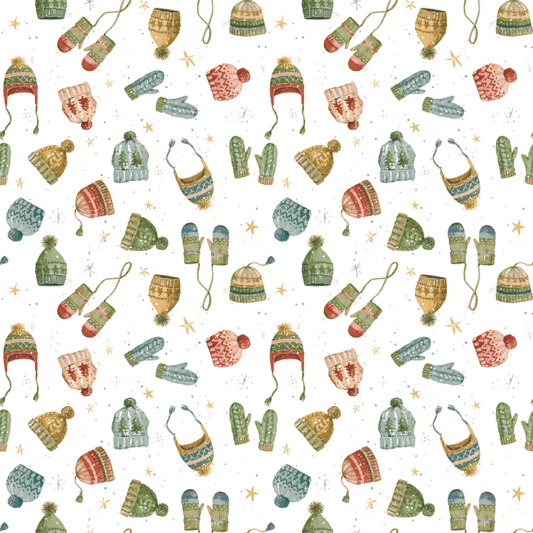 This print features tossed hats and mittens on a snowy background. 100% Cotton. Machine Wash Cold/Tumble Dry Low.