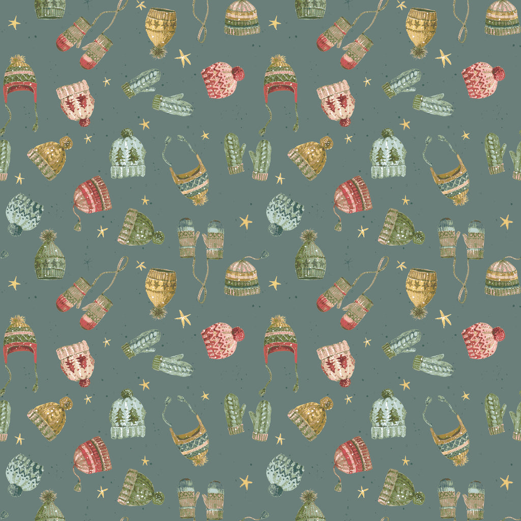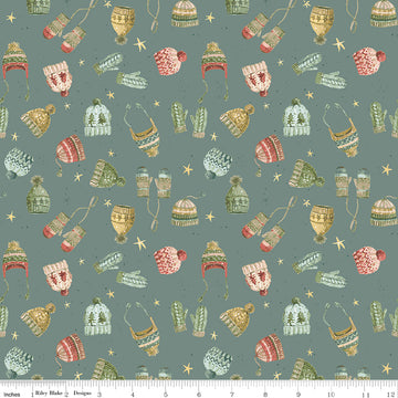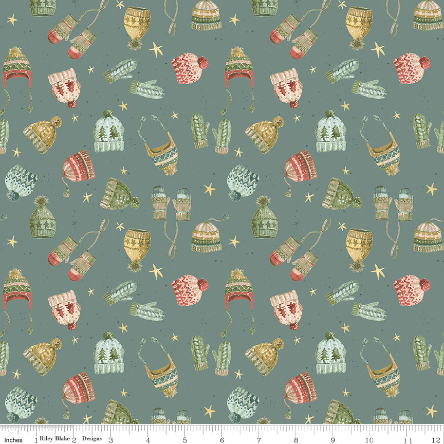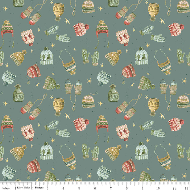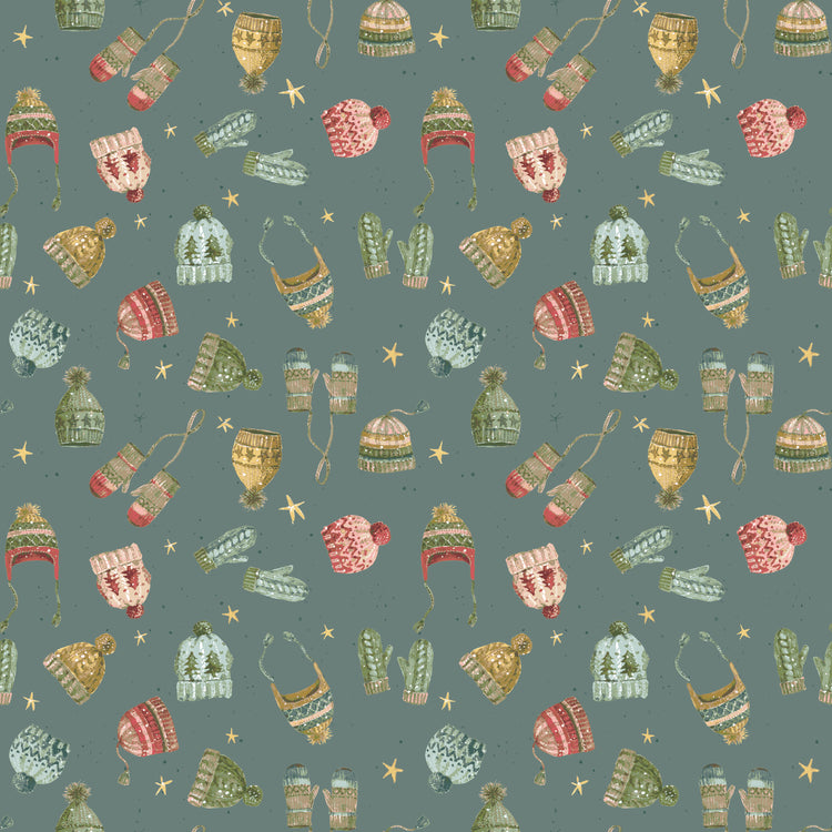 This print features tossed hats and mittens on a snowy background. 100% Cotton. Machine Wash Cold/Tumble Dry Low.