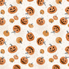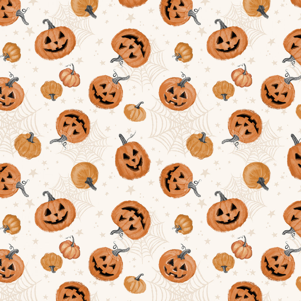 Meow-Gical Night has black cats with golden eyes and lacy colors, pumpkins and Jack-o-lanterns, spiders, webs, and ivy are tossed in various ways with stars and moons. Printed on 100% quilter's weight cotton.