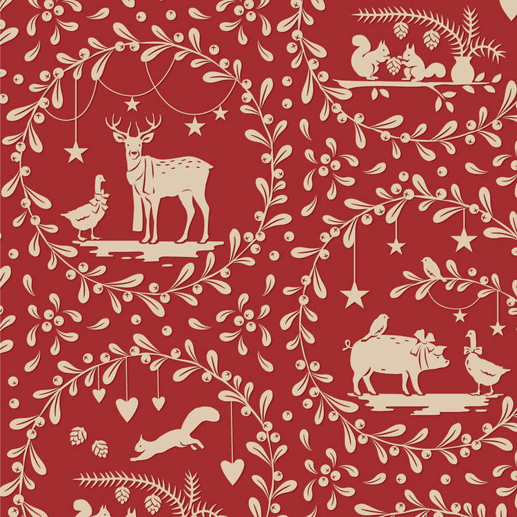 This 100% cotton print from Merry Little Christmas by Tilda Fabrics features Scandinavian-inspired papercut scenes in cream on a rich burgundy background. Motifs include deer, geese, birds, squirrels, and festive details like stars, hearts, pinecones, and garlands, arranged in framed circular vignettes. With its folk-art style and vintage holiday charm, this fabric is perfect for quilts, wall hangings, stockings, and festive décor.