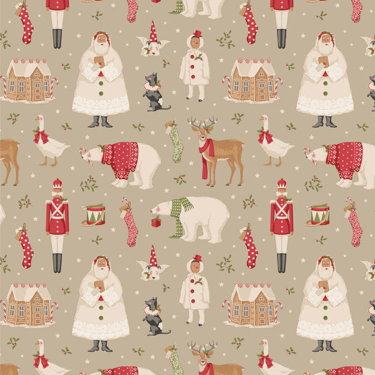 This 100% cotton print from Merry Little Christmas by Tilda Fabrics features Santa, toy soldiers, polar bears in festive scarves and sweaters, reindeer, geese, gingerbread houses, and playful woodland friends on a warm clay background. The detailed motifs are perfect for fussy cutting, making it a wonderful choice for quilt blocks, stockings, pillows, and handmade holiday décor.